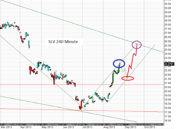 I followed that up with this post indicating that silver had a bit further to fall but that it would be a buying opportunity, not a sell signal. Today we hit the lower channel as you can see from the chart below. It took a bit longer to get there than anticipated and thus we did not quite hit my price target but with EW the shape of the wave is more important than absolute prices. As a result of hitting this lower channel, I suspect the pullback in silver could be over for now.